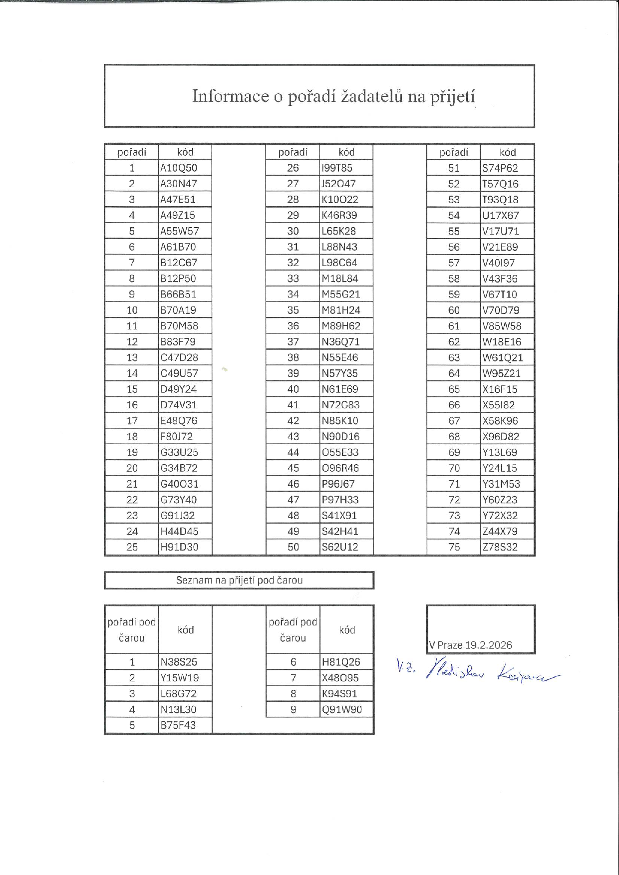 Níže uvedená informace obsahuje aktuální pořadí nepřijatých žadatelů pod čarou